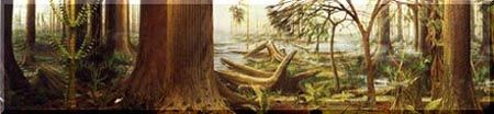 Waldsumpfmoorlandschaft in der Steinkohlenzeit.